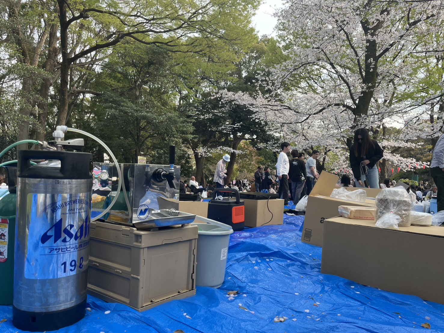 ビールサーバーを設置したお花見は珍しく、周囲の花見客からの視線も集まり、イベントとしての特別感がさらにアップしていました。